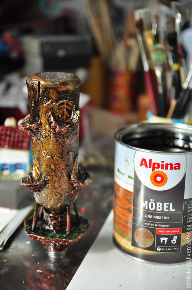 22. После этого беру бронзовую красочку и тонким слоем наношу бронзовый акрил, так, чтобы проявилась фактура бутылочки. Лишнюю краску на кисти снимаю на палитре и на любом ненужном листочке.