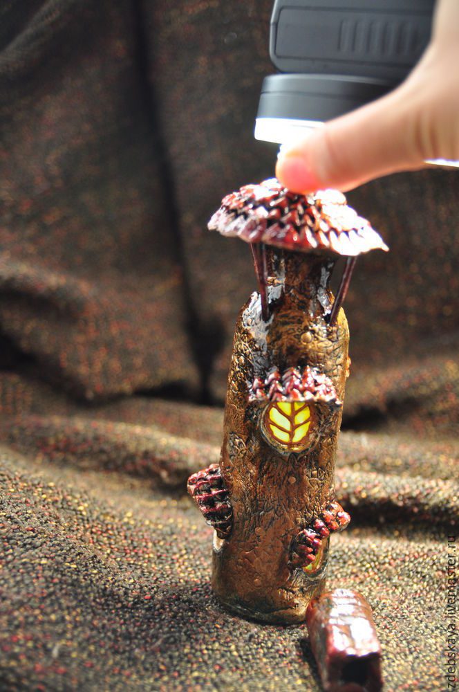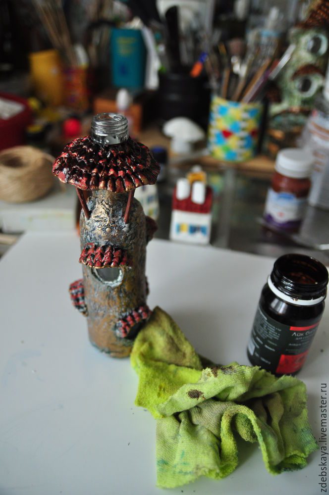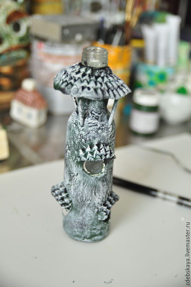 Думаю, если вы в ладах с электроникой, то можно придумать маленькую лампочку на батарейках, тогда в доме будет свет. А так, вполне себе функциональная бутылочка получилась. Можно туда налить чего-нибудь, ну или свернуть записку трубочкой:)