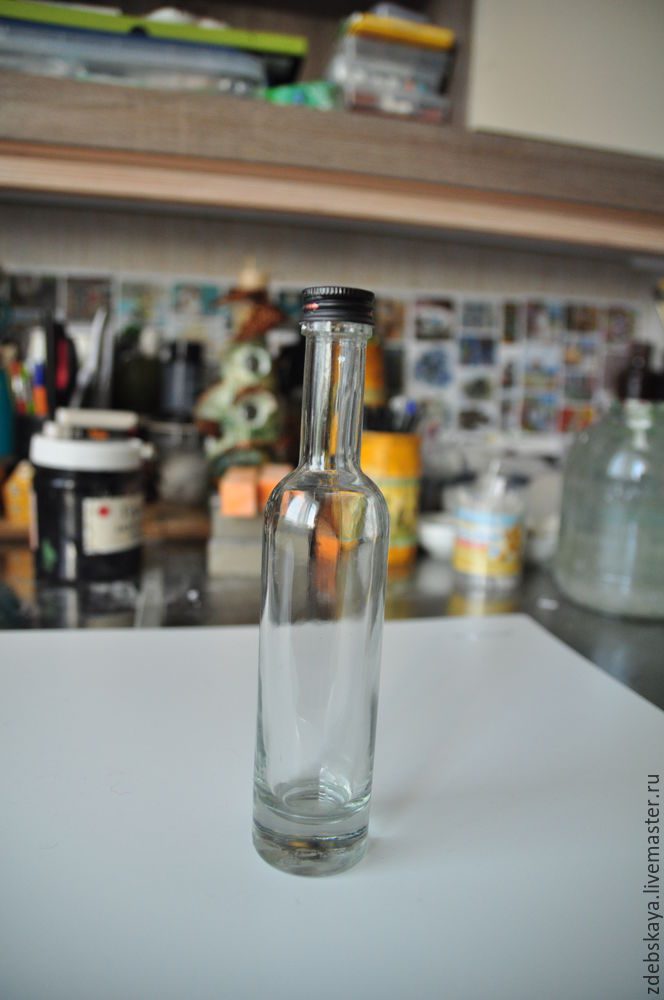 1. Берём бутылочку, из которой мы и будем делать красоту. У меня это маленькая бутылочка на 100 мл. Начиная декорировать бутылочку, помните, чем бутылка больше, тем она будет тяжелее в итоге! Отмываем, сдираем с неё все этикетки, убираем следы её прошлого:) Затем обезжириваем её до скрипа. И получаем вот такую чистую бутылочку!
