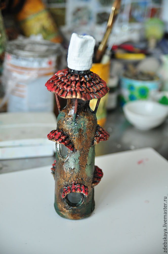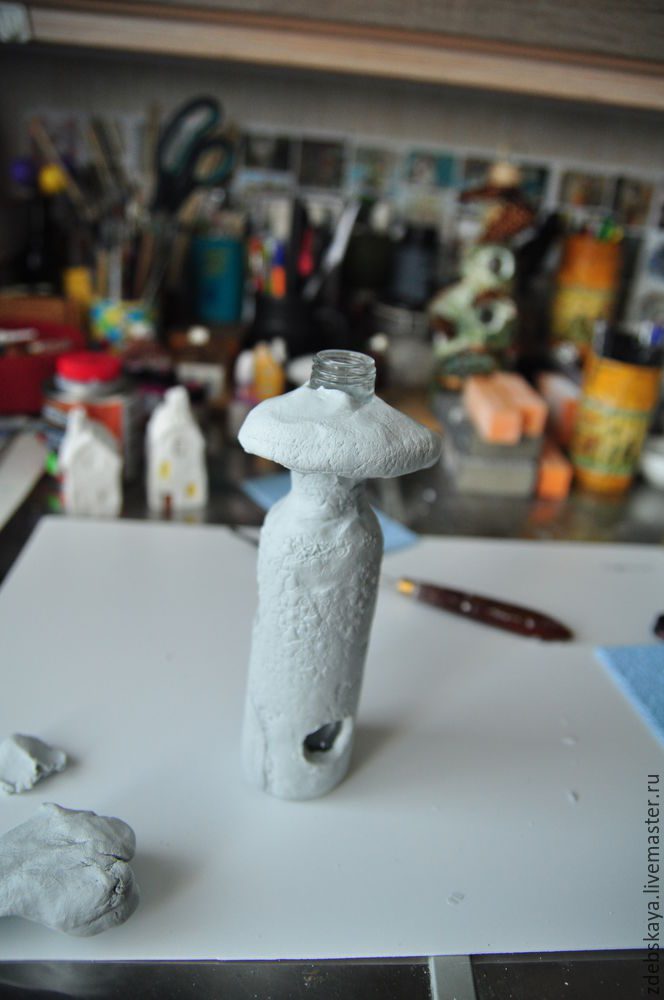 10. Затем, у моего домика должна быть крыша. Её я делаю, сформировав толстую колбаску и обернув вокруг горлышка. Приминаем пальцами, получаем «грибную шляпку».