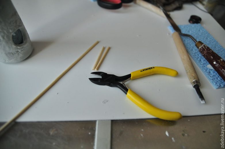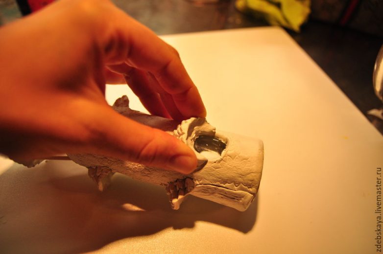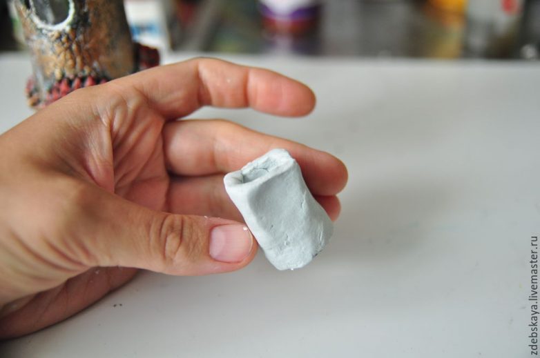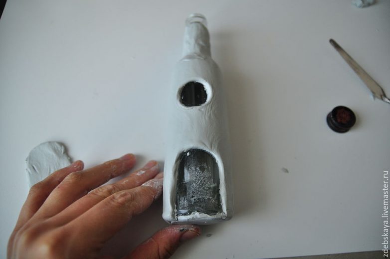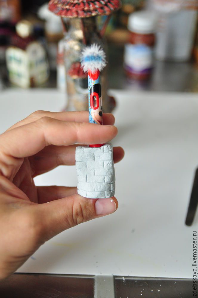23. Теперь вспоминаю, что трубы у домика нет. Эх… надо исправить! Бутылка сохнет, лепим трубу. Аналогичным способом, как и бутылку. Только подробнее остановлюсь на кирпичной кладке.