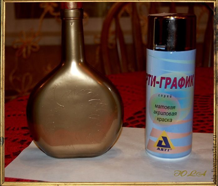 Покрывам всю бутылку золотой краской из баллончика. Не забываем про крышку.