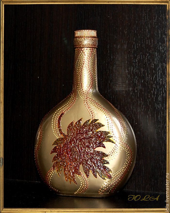 Вот и все, бутылка готова. Таким быстрым и простым способом можно задекорировать любую бытылку. А какую использовать картинку или узор точечной росписи, зависит только от вашей фантазии.