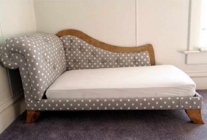 Интересный вариант оформить диванчик в сером цвете в горошек, стильное и прекрасное решение.