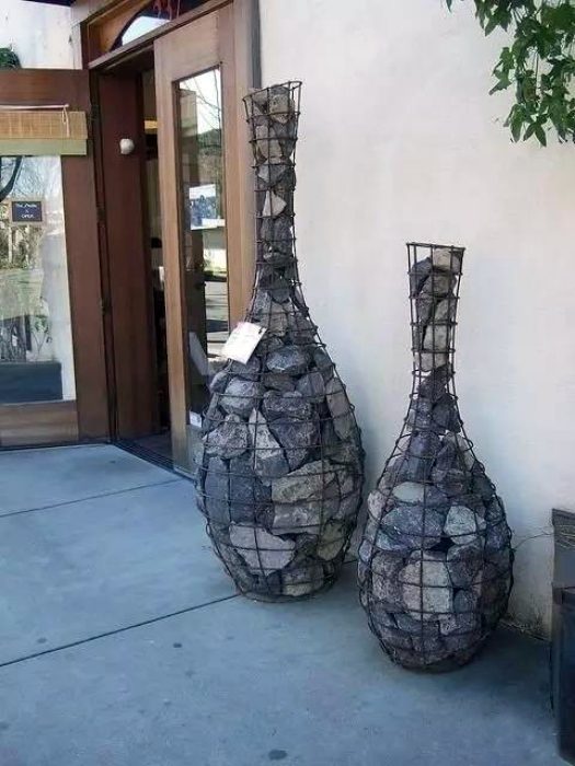 Чтобы, загородный участок не выглядел скучно и уныло стоит позаботится не только об удобстве, но и о надлежащем декоре. Огромные декоративные вазы, сделанные из габионной сетки и камней, станут достойным украшением сада или крыльца.