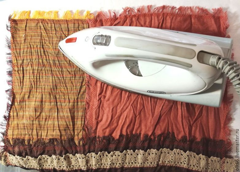 Весь шарф нужно аккуратно прогладить… Утюг переставляем с места на место. Не водить по ткани! Таким образом, закрепляем образовавшиеся заломы и складочки.