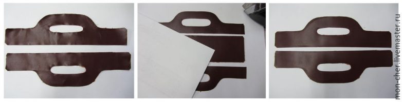 Затем на широкую часть приклеиваем укрепляющую тесьму (1,5 см), можно вырезать полоску из флизелина или дублерина (что есть в наличии). Промазываем резиновым клеем, загибаем к центру, отстукиваем молотком. Сразу делаем держатели для полуколец: вырезаем прямоугольники из кожи размером 32*40 мм, спускаем их края, насколько возможно, проклеиваем укрепляющей тесьмой, загибаем к центру.
