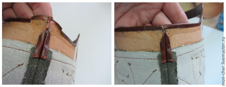 Закончим загибку верхнего канта: отрезаем припуски под углом, промазываем клеем и загибаем. Аккуратно отколачиваем молотком, чтобы кожа на шве не треснула.