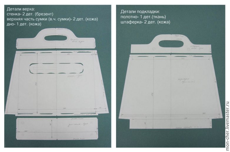 Делаем основные детали (я перекалываю шилом), добавляя припуски (на загибку — 7 мм, на тачной шов на коже — 7 мм, на тачной шов на ткани — 10 мм, на настрочной шов — 10 мм). Делаем намечания для настрачивания деталей и для установки фурнитуры (магнитки, пукли).