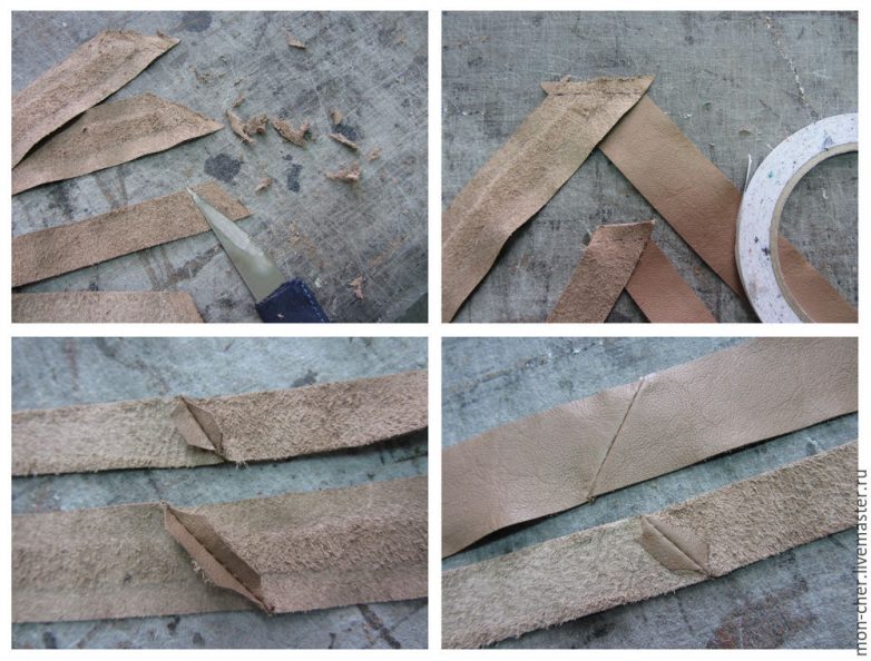У меня длины кожи не хватило, поэтому будем сшивать части ремешка. Все четыре части обрезаем под углом 45 градусов, ножом спускаем края, чтобы они почти уходили «на нет». Складываем, как показано на фото (чтобы части не смещались, склеиваем их небольшим кусочком двухстороннего скотча), и сшиваем, делая закрепки по краям. После прошивки скотч убираем, уголочки припусков подрезаем уголками, промазываем резиновым клеем и отстукиваем молотком.