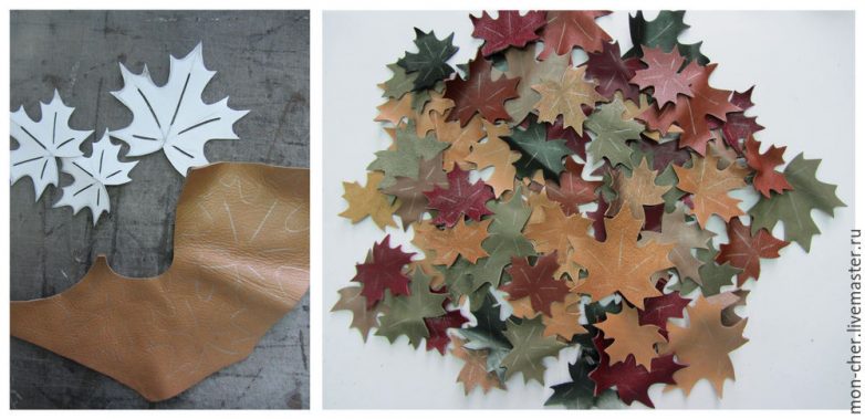 На самом деле, конструкция сумки ко мне пришла не сразу, сначала появилась идея создать «ворох листьев после листопада». Поэтому сначала появились шаблоны кленовых листьев из ватмана в трех размерах. И нашлись разные небольшие кусочки кожи нужных цветов (в процессе работы их у меня скопилось немало).
