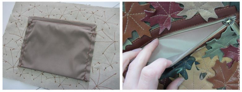 Перед тем как начать нашивать наш осенний декор, сделаем еще одну операцию. Правда, если вы не хотите делать карман на наружной части сумки, можете пропустить этот момент. Но я очень люблю, когда карманов достаточно, всегда найду что в них положить. По шаблону вырезаем кожаную деталь для кармана, делаем в ней прорезь по размеру будущего кармана (у меня 10*180мм), с помощью резинового клея вклеиваем молнию с бегунком. Подклеиваем на основную деталь сумки (можно использовать двухсторонний скотч) и пришиваем по периметру. И пока забудем об этом. Вернемся, когда весь декор уже будет нашит.