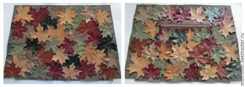 Начали вырезать… Только еще перед этим на трафаретах надо вырезать намечания для строчки (прожилок наших листиков). Обводим детали листьев серебряной ручкой по лицу кожи (потом она стирается белой стирательной резинкой, кроме как с замши и кожи без покрытия, поэтому сначала, конечно, лучше проверить на краешке кожи). Если где-то листик не влезает целиком, то можно эту часть сделать чуть меньше. Так даже будет «живее», ведь в природе всё несимметрично. Главное, чтобы уголки листиков оставались острые. И вот такой живописный осенний «ворох» получился. У меня вышло всего 70 листочков разной величины.