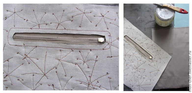 После этого можно вернуться к нашему карману. Открываем молнию и делаем ножом надрез, затем с изнанки аккуратно ножницами вырезаем прорезь кармана. Промазываем прорезь резиновым клеем, также мажем клеем края подкладки кармана (по лицевой стороне). Подклеиваем подкладку к карману. Пришиваем: сначала делаем нижнюю строчку (подкладка отогнута вверх), затем верхнюю и боковые (подкладка уже отогнута вниз).