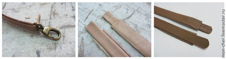 Длинный ремешок делаем так. Выкраиваем 2 длинных отрезка кожи длиной 130 см (в зависимости от желаемой длины в конечном результате) шириной 2 и 3 см (это чтобы в итоге получился ремешок шириной 1,5 см). Лучше взять не толстую кожу, чтобы не требовалось ее спускать (сложите кожу в три раза, это и будет толщина будущего ремешка). Если у вас толстая кожа, то лучше края сделать в обрезку, для этого выкраивается одна часть нужной ширины (1,5 см), вторая на 4-5 мм шире, узкая часть приклеивается на широкую, прострачивается, а излишки по краям обрезаются.