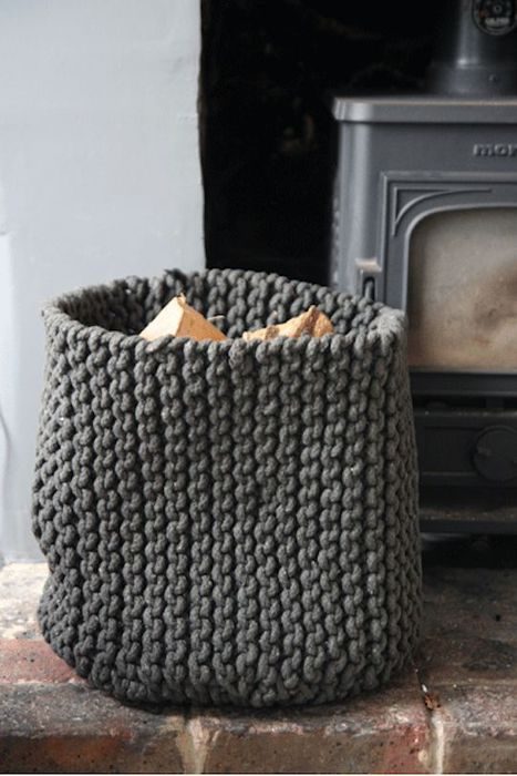 Например, пространство гостиной удачно украсят самодельные вязаные корзины, в которых можно хранить дрова, пледы, книги или даже пульт от телевизора. Тут уже всё зависит от фантазии.