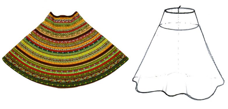 Сначала шьем основу — юбку-полусолнце из нетолстой ткани (лен или хлопок), на которую мы поэтапно будем нашивать тесьму. Юбку лучше сшить на кокетке, поскольку тесьма «держит форму» и расширение от талии будет создавать ненужный объем. (фото 1)