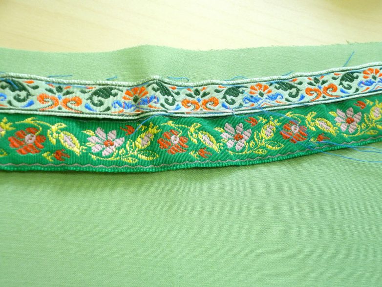 После наметки прошиваем шов на машинке, а наметку удаляем. Можно оба края особенно красивых тесемок нашивать поверх соседних, можно использовать кружево — все зависит от вашей фантазии. Нашивать каждую следующую тесьму надо с одного выбранного вами края юбки, и продолжать так на протяжении всей работы над изделием, до самого низа.