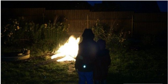 Процесс сжигания тем временем продолжался дотемна, чтобы не палить сильный костер, жгли помаленьку, получились этакие вечерние посиделки у костра вечером. Дети грустили.
