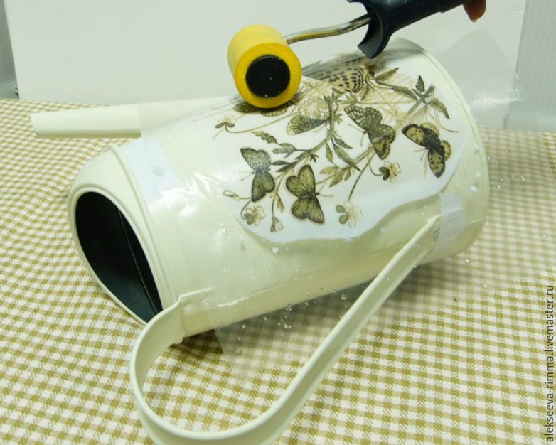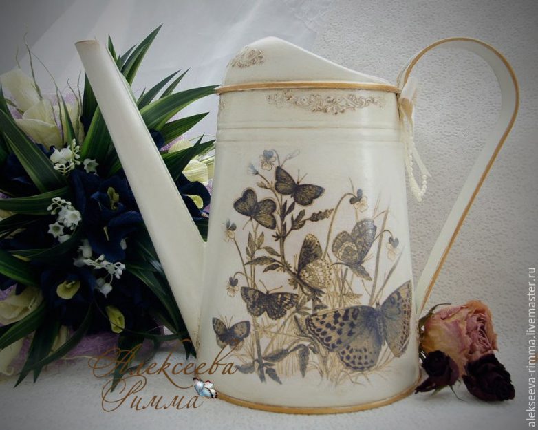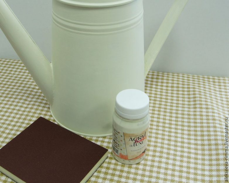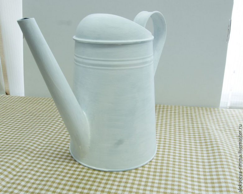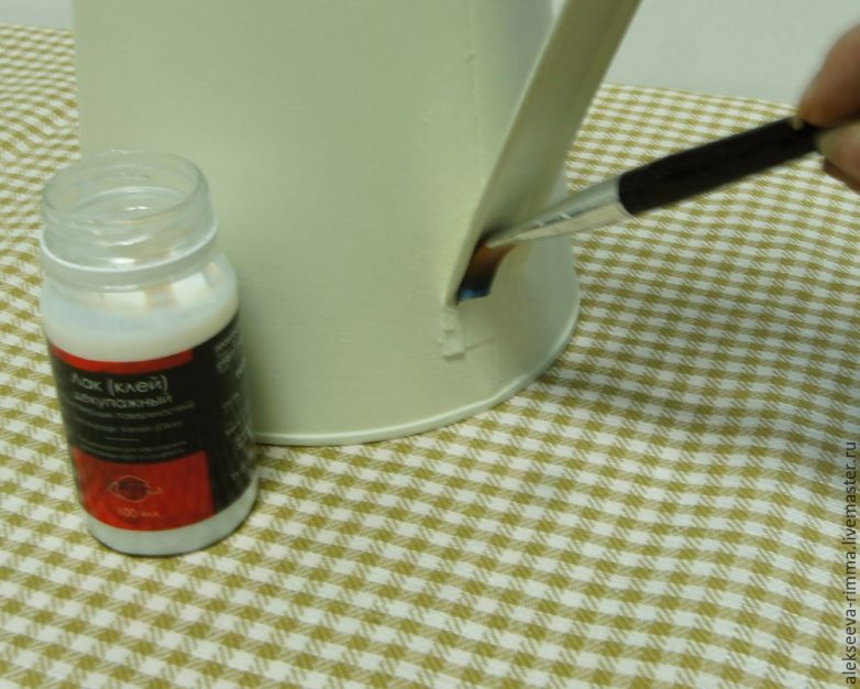 Приступаем к декупажу. Первым делом, нужно обезжирить поверхность лейки спиртосодержащим раствором. Ни в коем не случае не шкурить! Для грунтовки, я обычно использую акриловую эмаль, (отлично держится даже на металле) можно наносить меховым валиком или кисточкой в несколько слоев с просушкой. Очень важно — хорошо просушить для следующей работы.