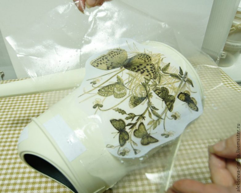 Приклеить распечатку на лак-клей на лейку с помощью файла и прикатать валиком.