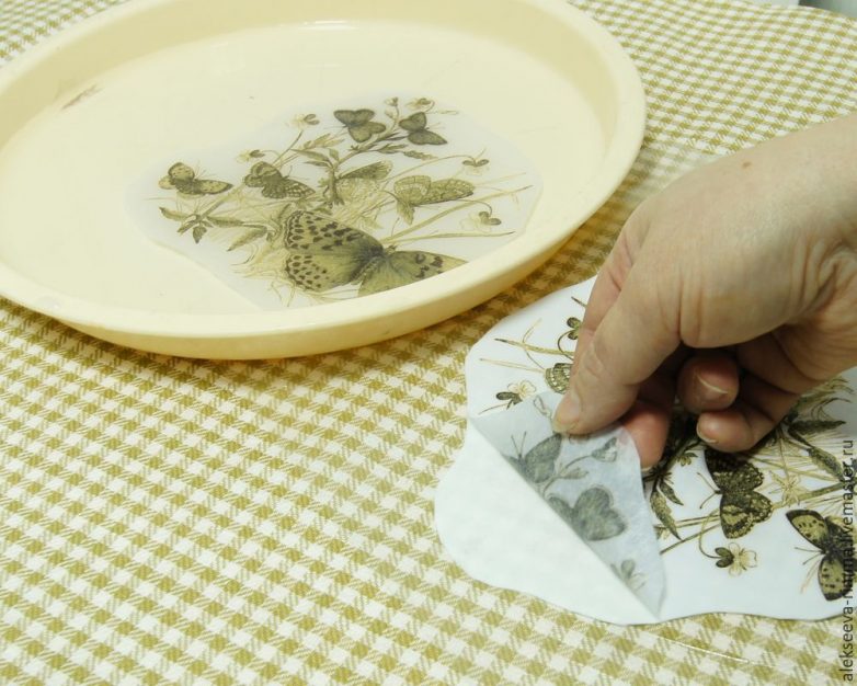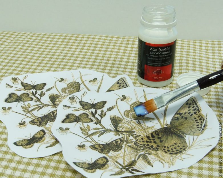 Для того чтобы сделать объемный рисунок контурной пастой на лейке, мы нанесем узоры — шаблоны методом вживления в лак. Для этого берем распечатанные узоры, вырезаем нужный размер и покрываем на 1 слой лака (клея) по лицевой стороне картинки. Так же одним слоем лака покрываем те места на лейке, где будем рисовать узоры. Просушить. Наносим второй слой лака на картинку и на лейку и сразу приклеиваем, пока лак не подсох. Хорошо прижмите картинку!