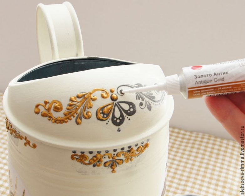 Нанесите на палец контурную пасту и размажьте по краям ручки и ободков лейки. Нанесите несколько слоев акрилового лака.