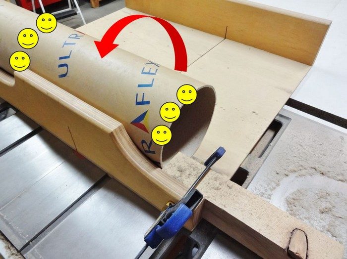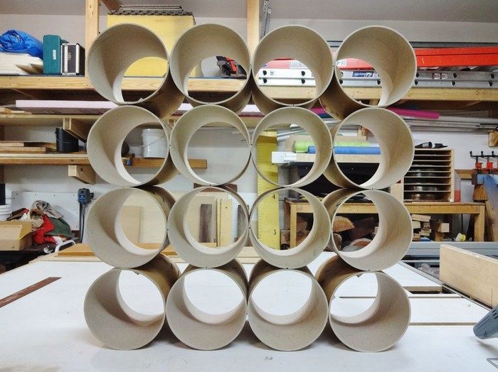 Автор использовал циркулярную пилу, попросту срезав все лишнее. Но он же предлагает альтернативу: поставить рулон вертикально, а рядом разместить «меру высоты» – к примеру, стопку книг. Отметьте карандашом вершину и, аккуратно проворачивая рулон вокруг свой оси, начертите круг. Срежьте всё лишнее ручной пилой. Повторите с остальными рулонами.