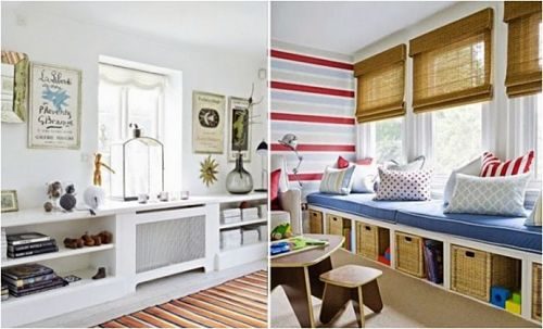 В случае, если комната имеет достаточно мало места, то можно использовать место под подоконником. Ниши в таком месте могут как скрываться за шторкой или небольшими дверками, так и являться полностью открытыми. В обоих случаях они сберегут для вас немного пространства. Ещё в данной зоне можно установить несколько выдвигающихся ящиков. В общем, согласно индивидуальным требованиям можно сделать все что необходимо.