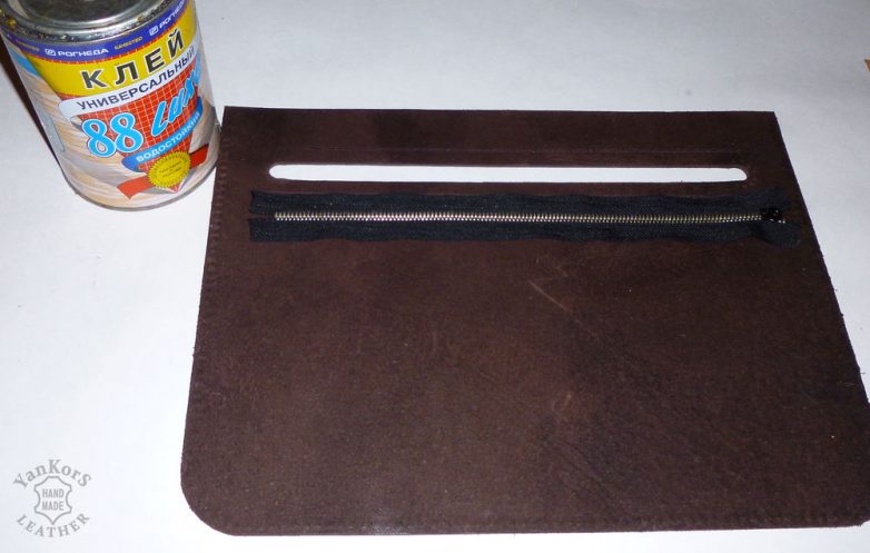 Теперь займемся задним карманом для молнии. Делаем прорезь шириной 12 мм. (для молнии №5) на задней стенке. От краев приблизительно 3 см. Я сперва пробил отверстия высечкой, потом «соединил» их ножом. По периметру пробиваем отверстия для строчки, Отрезаем молнию по размеру с напуском по длине. Также можно удалить пасатижами лишние зубчики. Приклеиваем и прошиваем. Чтобы молния была по середине прорези и располагалась ровно лучше перед приклеиванием измерить её ширину и разметить границы приклеивания.