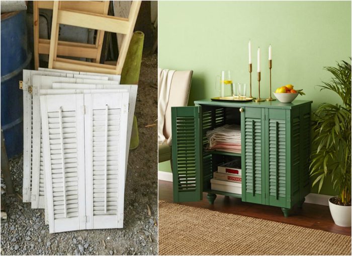 Задумали заменить ветхие деревянные ставни на даче? Не спешите отправлять их на помойку. Качественная покраска, кусок фанеры, деревянная столешница и мебельная фурнитура позволят превратить ветошь в очаровательный шкафчик.