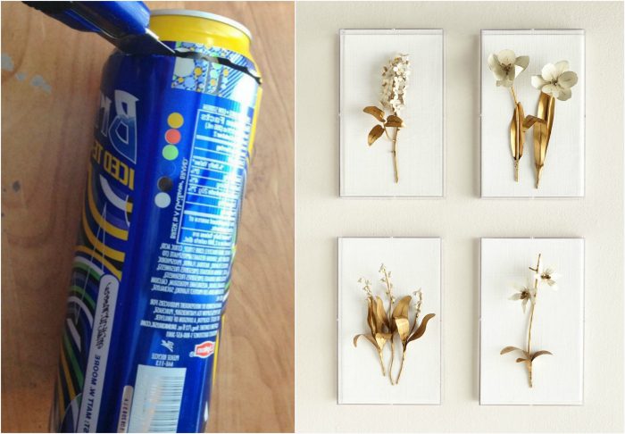 Часто покупаете напитки в жестяных банках? Тонкий алюминий, из которого они сделаны — замечательный материал для творчества. Вырезайте из банок различные фигурки, красьте, крепите к холстам и используйте их для декора стен.