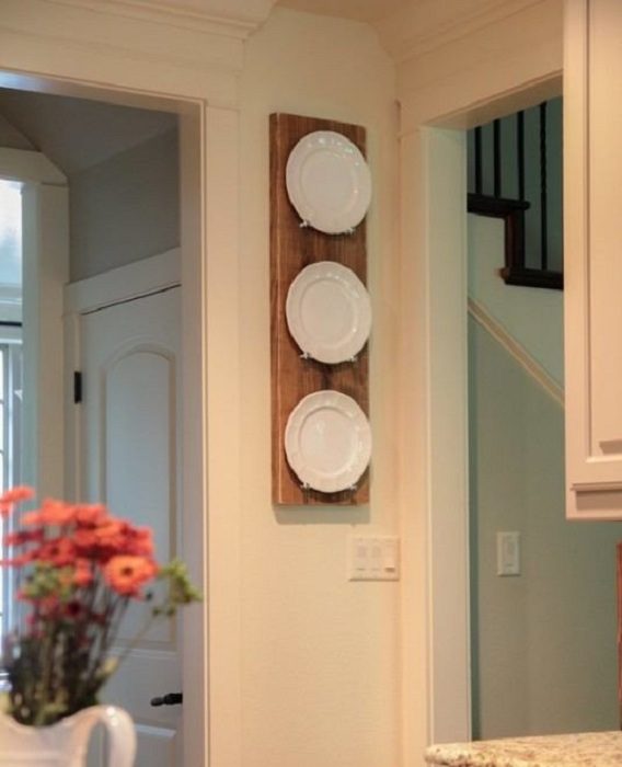 Просто прекрасный вариант разместить тарелки оригинальным образом на стене кухни.