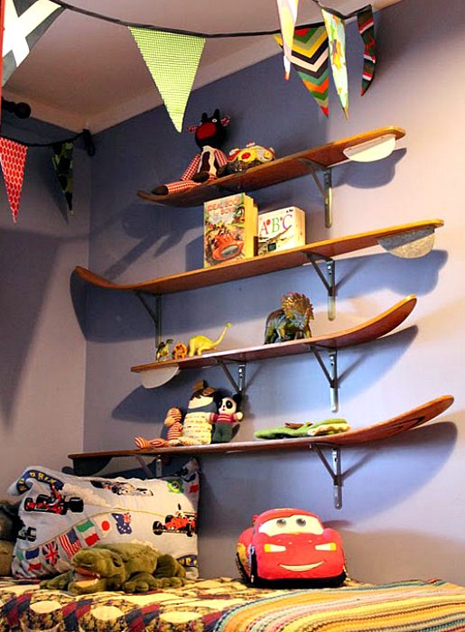 Старые лыжи, много лет пылящиеся в кладовке, можно использовать для создания необычных полок. Такие полочки прекрасно впишутся в интерьер детской и подойдут для хранения игрушек и книг.