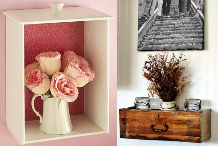 Выдвижные ящики старого стола, приготовленного на выброс, можно использовать для создания оригинальных полочек. Аккуратно покрашенные и видоизмененные на свое усмотрение ящики можно крепить к стене, как вертикально, так и горизонтально и использовать для хранения самых разных вещей.