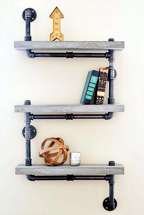 Стильная система хранения в актуальном сейчас индустриальном стиле, которую можно сделать из древесины или МДФ плит, покрашенных в серый цвет и соединенных между собой конструкцией из металлических водопроводных труб.