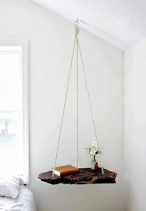 Плотный кусок коры или необработанной древесины можно превратить в фантастическую подвесную полку, которая станет оригинальной альтернативой стандартной прикроватной тумбе.
