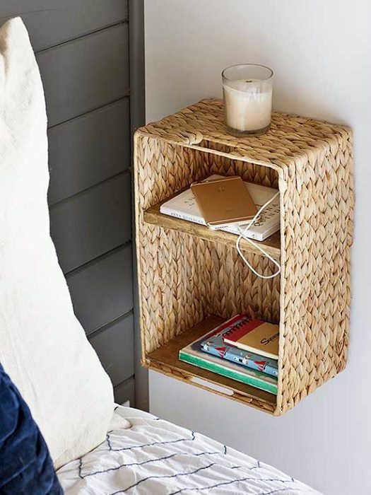 Небольшую плетеную корзину можно превратить в стильную и вместительную полку или прикроватную тумбу открытого типа. Такая полка прекрасно подойдет для хранения газет, журналов, очков, расчески и прочих мелочей, которые должны быть под рукой.