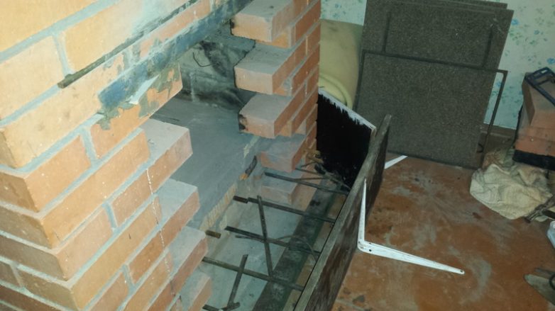 Чтобы при разборке печь не разрушилась полностью, некоторые места укрепил стальным квадратным прутком и уголком, посадив их на плиточную мастику.