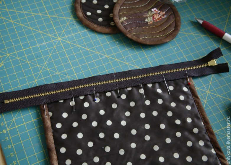 В заготовке по короткой стороне определяем центр, совмещаем центры молнии и заготовки, скалываем булавками. Молния по 5 см с каждого края с запасом.