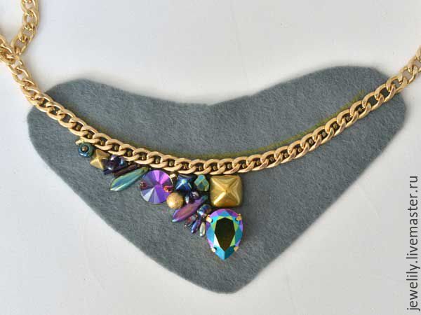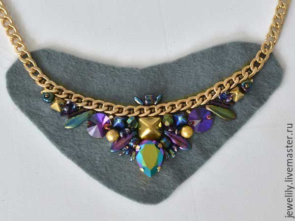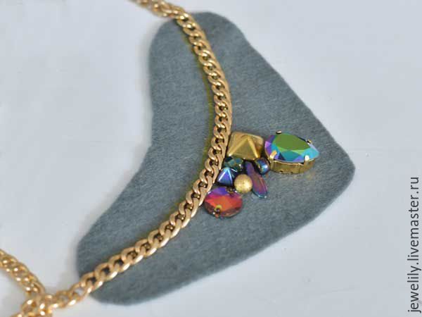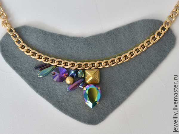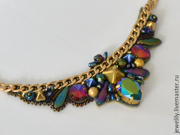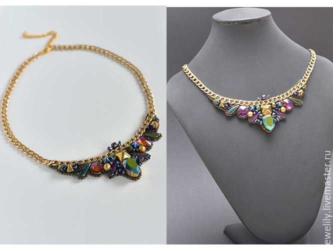 Сегодня мы будем делать оригинальное колье на цепочке, вышитое кристаллами Сваровски, бисером и бусинами.