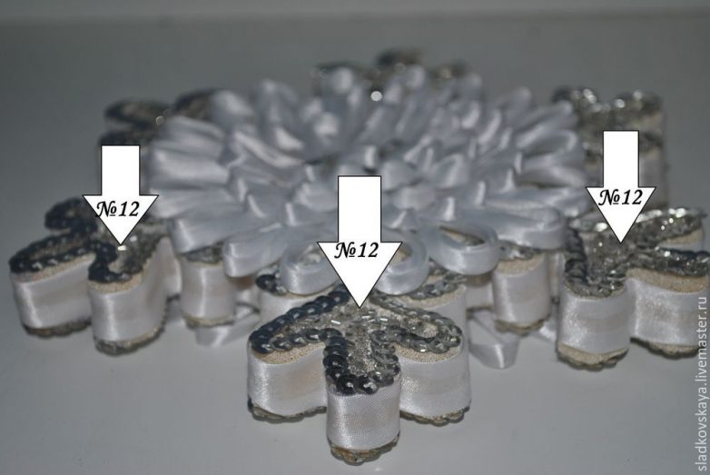 4. Ширина снежинки у меня была почти размером с косую бейку, поэтому сразу закрыла этот срез, то есть приклеила по периметру снежинки.