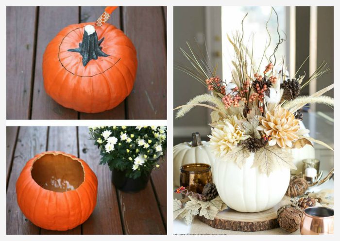 Небольшую тыкву можно превратить в очаровательную цветочную вазу, которая станет необычным украшением любого пространства. Перед тем, как приступить к декору, овощ нужно тщательно вымыть, срезать верхушку и с помощью ложки извлечь семечки и мякоть. Далее кожуру тыквы следует покрыть герметиком, а после его высыхания аккуратно покрасить с помощью кисти и акриловой краски желаемого цвета. Чтобы ваза прослужила дольше, тыкву лучше высушить. Сделать это достаточно просто, нужно набить овощ бумагой и оставить на некоторое время в теплом помещении, причем бумагу нужно менять до тех пор, пока она не перестанет пропитываться соком. В получившуюся вазу можно поставить букет сухих веток, колосков или поместить вовнутрь небольшую емкость с водой и хранить букет живых цветов.