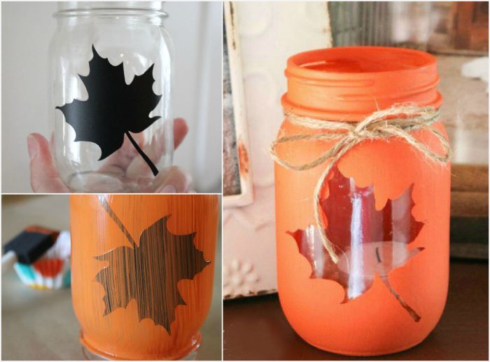 Кленовый лист или его фигурка, вырезанная из бумаги, и оранжевая эмаль позволят превратить обычную стеклянную банку в оригинальный осенний подсвечник.