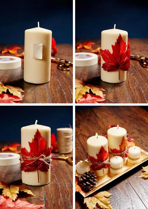Обычные парафиновые свечи можно украсить с помощью пожелтевших листьев, собранных в парке и бечевки. Композицией из нескольких свечей, шишек и желудей, выложенных на блюде, можно украсить обеденный стол, камин или туалетный столик.