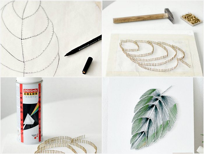 Для создания такого оригинального панно понадобиться небольшой кусок древесины, белая краска, много гвоздей и нитки нескольких оттенков одного спектра. Сначала следует покрасить деревянную основу с помощью баллончика с аэрозольной краской, после чего сделайте карандашный набросок выбранного изображения и начинайте забивать гвозди по его контуру. Осталось только соединить гвозди паутиной из ниток и фантастическое панно готово.