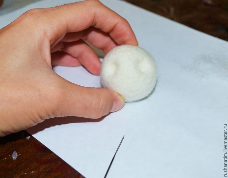 Начнем работу с головы панды. Для этого возьмем небольшой кусок кардочеса. Свернем его в виде шарика и при помощи иглы(звездочка 36) уплотним. Иглу втыкаем максимально глубоко, что бы шерсть свалялась внутри заготовки, а поверхность осталась достаточно рыхлой. Иглу стараемся втыкать в нашу заготовку под прямым углом, это позволит избежать повреждения иглы. Получаем такой шарик, рыхлый снаружи и плотный внутри.