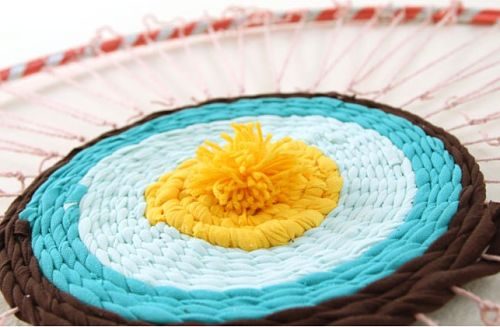 Удобнее начать с обычной пряжи или тонких нитей из футболки, чтобы серединка ковра получилась плотной.Выберите направление, либо по часовой стрелке или против часовой, оплетайте аккуратно, тщательно соблюдая направление верхней и нижней нити, чтобы ковер получился красивым.