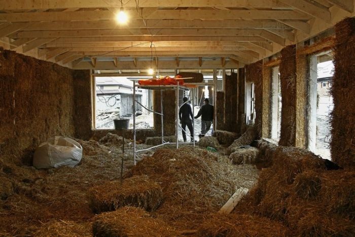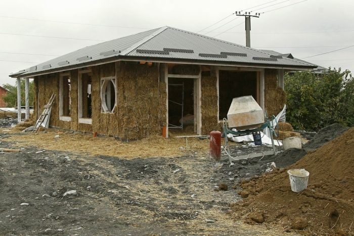Фундамент, конечно, бетонный. Крыша делается тоже по обычной технологии — из черепицы или профнастила. Зато теплопроводность пятидесятисантиметровых соломенных стен идентична теплопроводности кирпичных толщиной в четыре метра.»