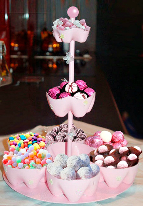 Донышки пластиковых бутылок разного объема, покрашенных в желаемый оттенок, можно использовать для создания эффектной многоуровневой подставки для удобного и красивого хранения сладостей.